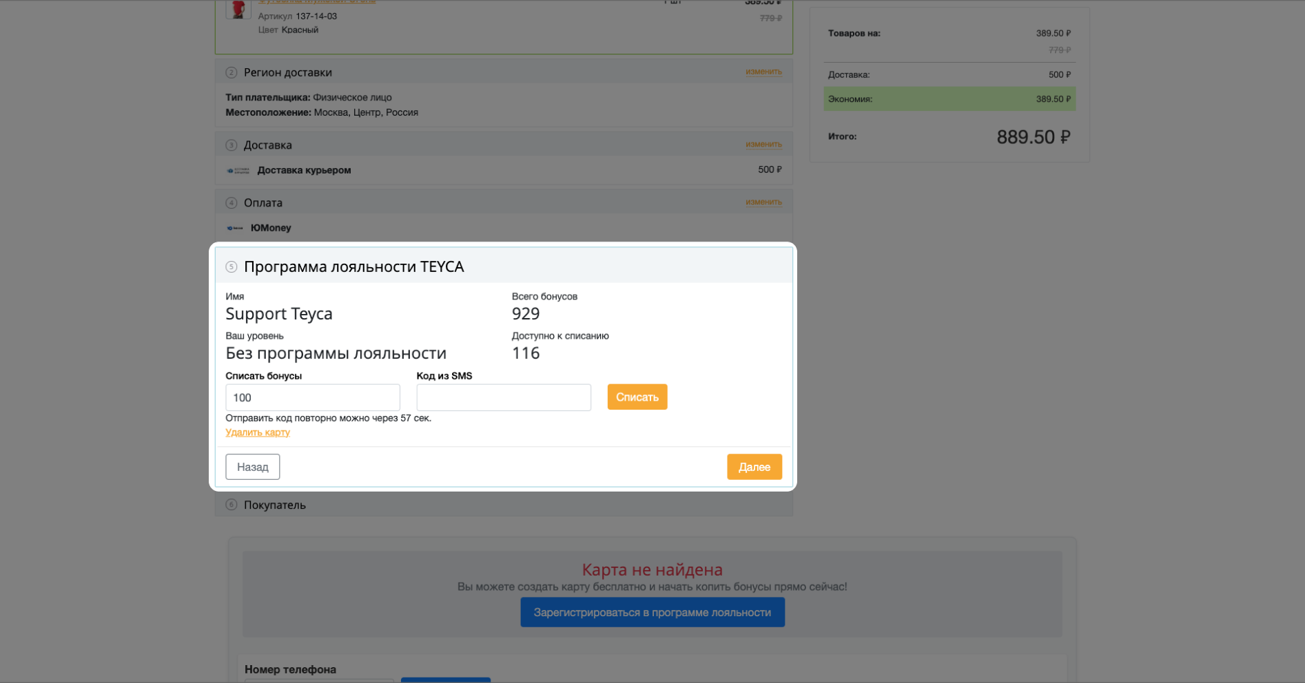 • В блоке "Программа лояльности TEYCA"* указать номер телефона для поиска карты в системе лояльности или пройти регистрацию.